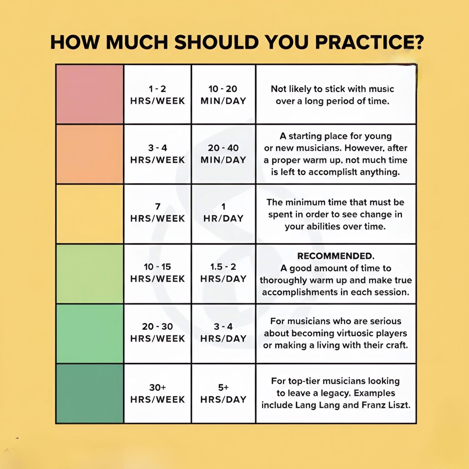 I found this chart online providing a guide for the right level of practice to musically improve with your insturment